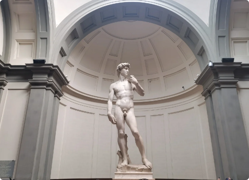 然而米开朗基罗看到的不是瑕疵,而是一个人——一个蓄势待发的年轻人,目光坚毅,手持投石带,即将迎战巨人歌利亚。